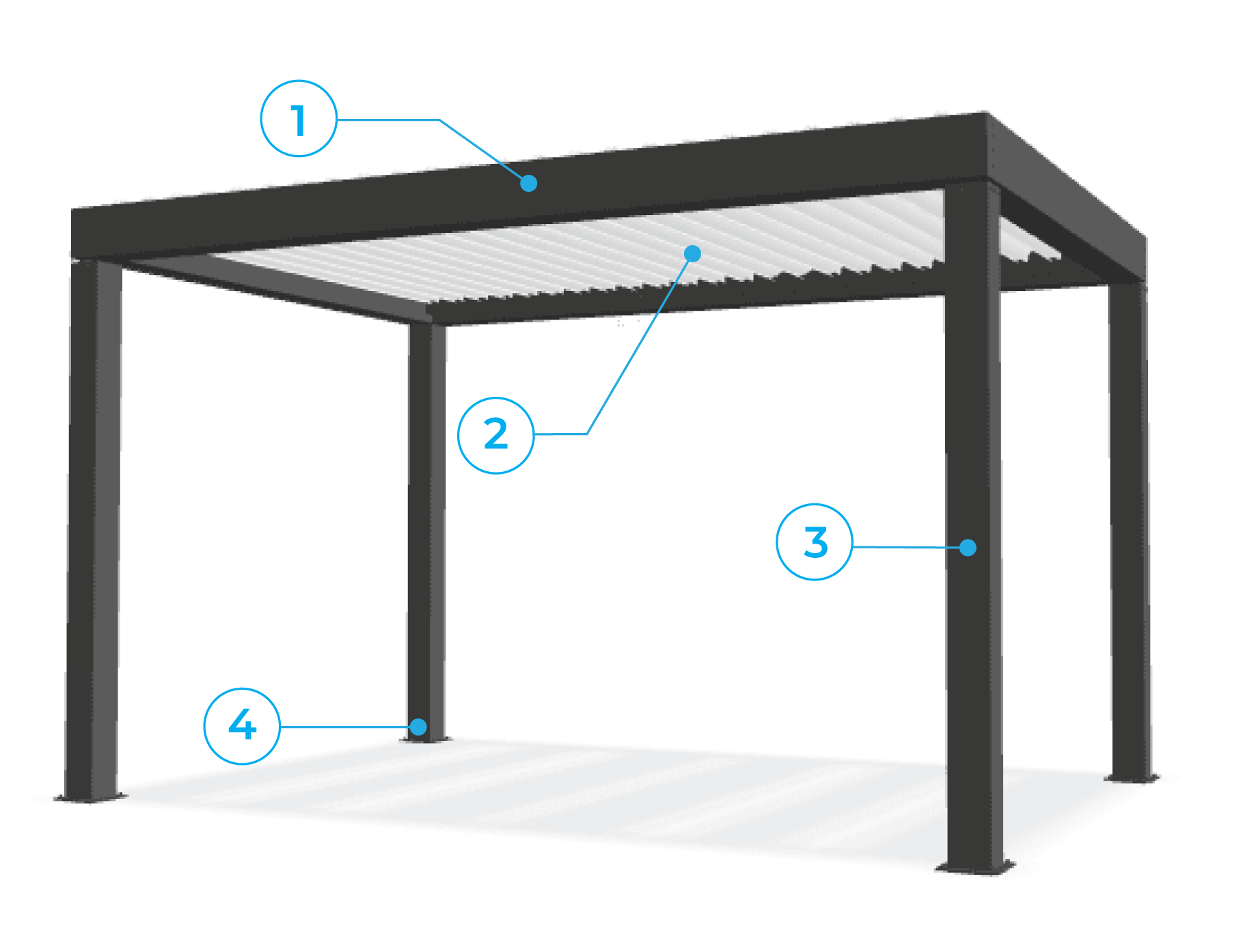Datorită materialului din care este confecționat (aluminiu), sistemul reprezintă o soluție viabilă în timp, cu rezistență mare la coroziune și intemperii. Acoperișul bioclimatic este prevăzut cu lamele din aluminiu reglabile pe diferite unghiuri, acționate prin telecomandă cu rol de protecție contra intemperiilor, a razelor UV și, în același timp, permite alimentarea spațiului cu aport de aer proaspăt.